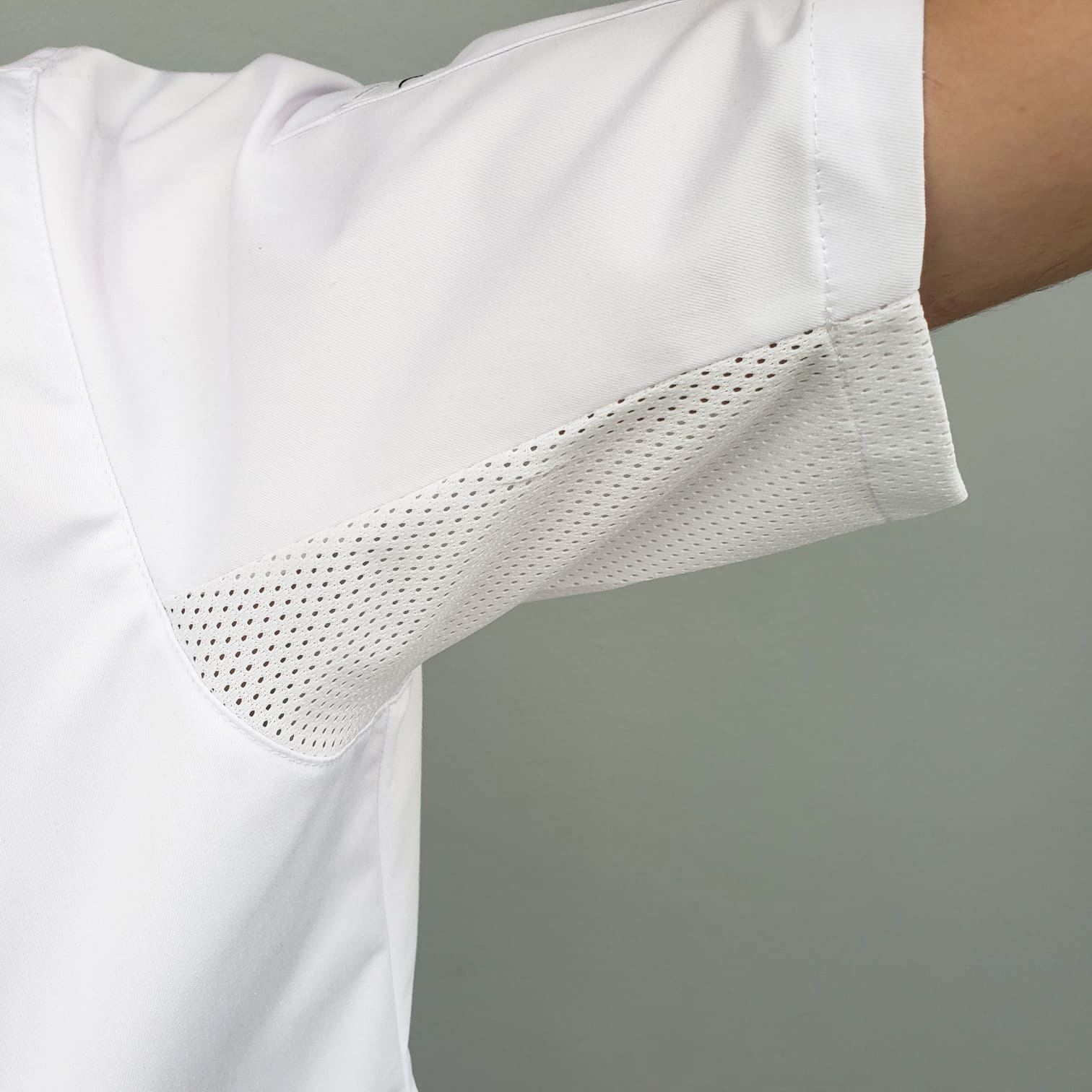 Chaqueta blanca manga corta, abertura a los lados, pasador en el cuello, malla en espalda y bajo la manga, ligera y suave al tacto composición 65% poliéster 35% algodón