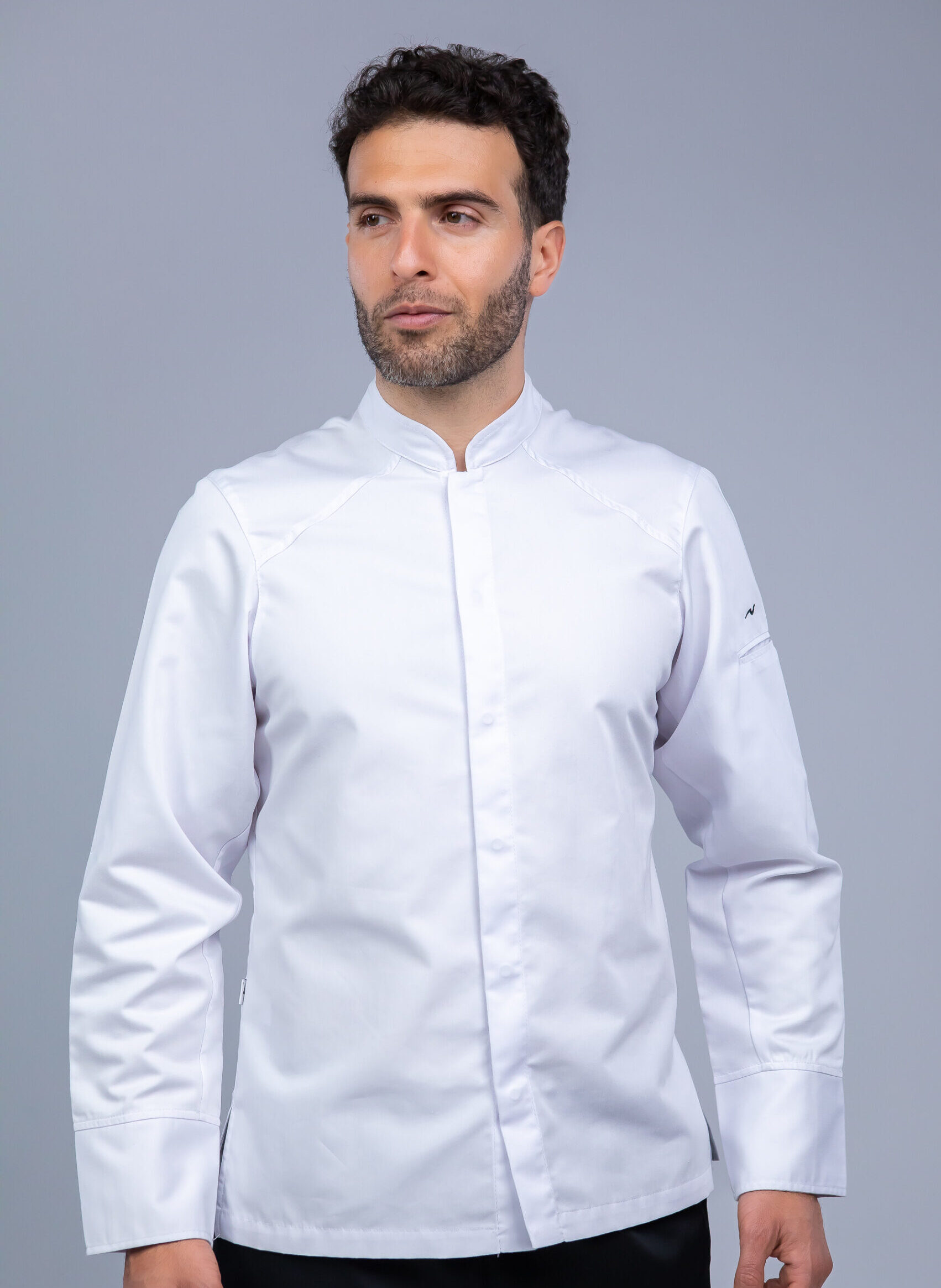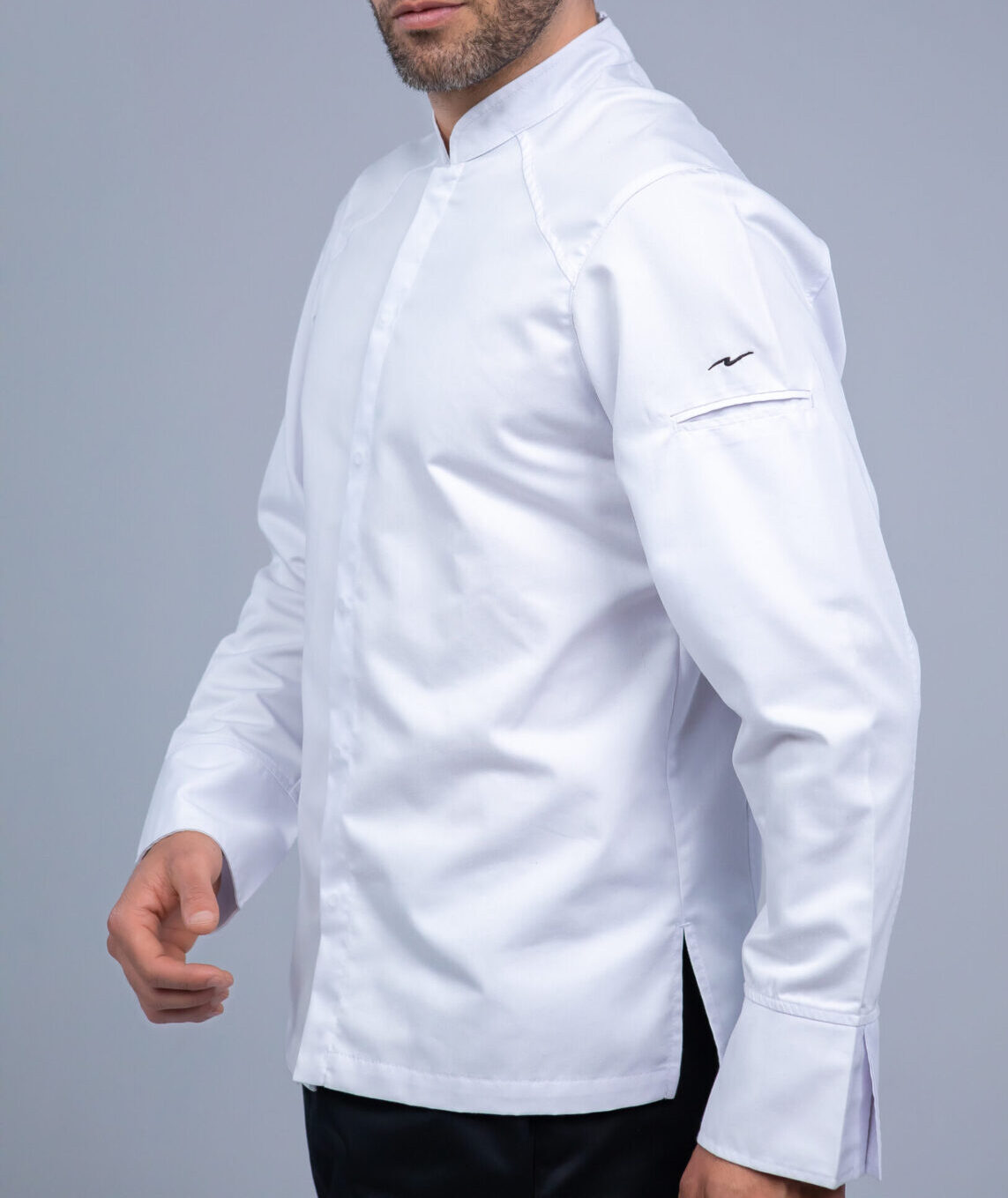 Chaqueta blanca manga larga, abertura a los lados, manga larga, broche escondido, diseño en espalda,