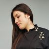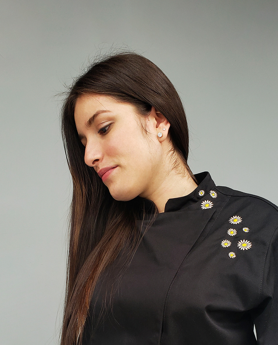 Chaqueta clásica chef, color negra, manga corta, bordado en cuello y pecho Margaritas