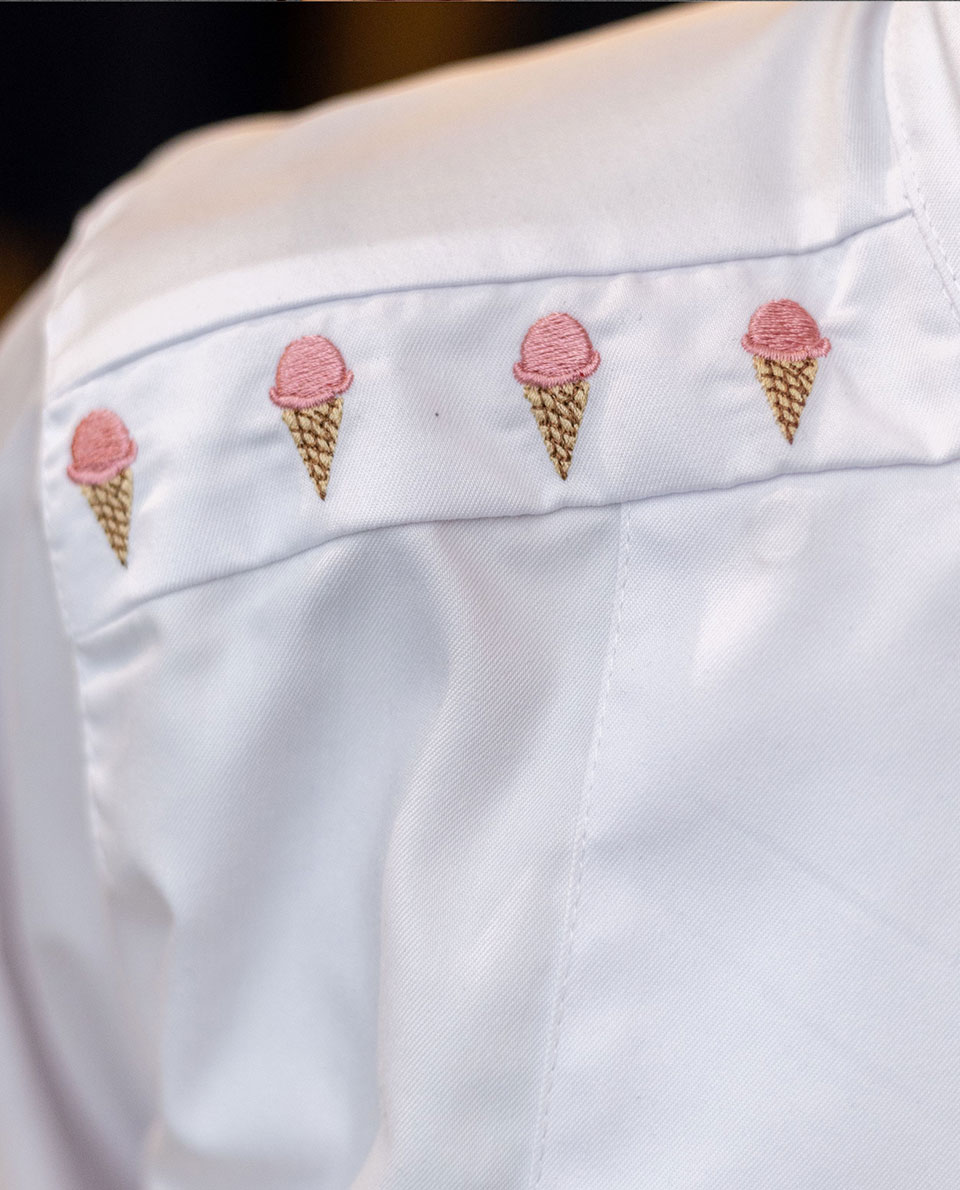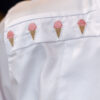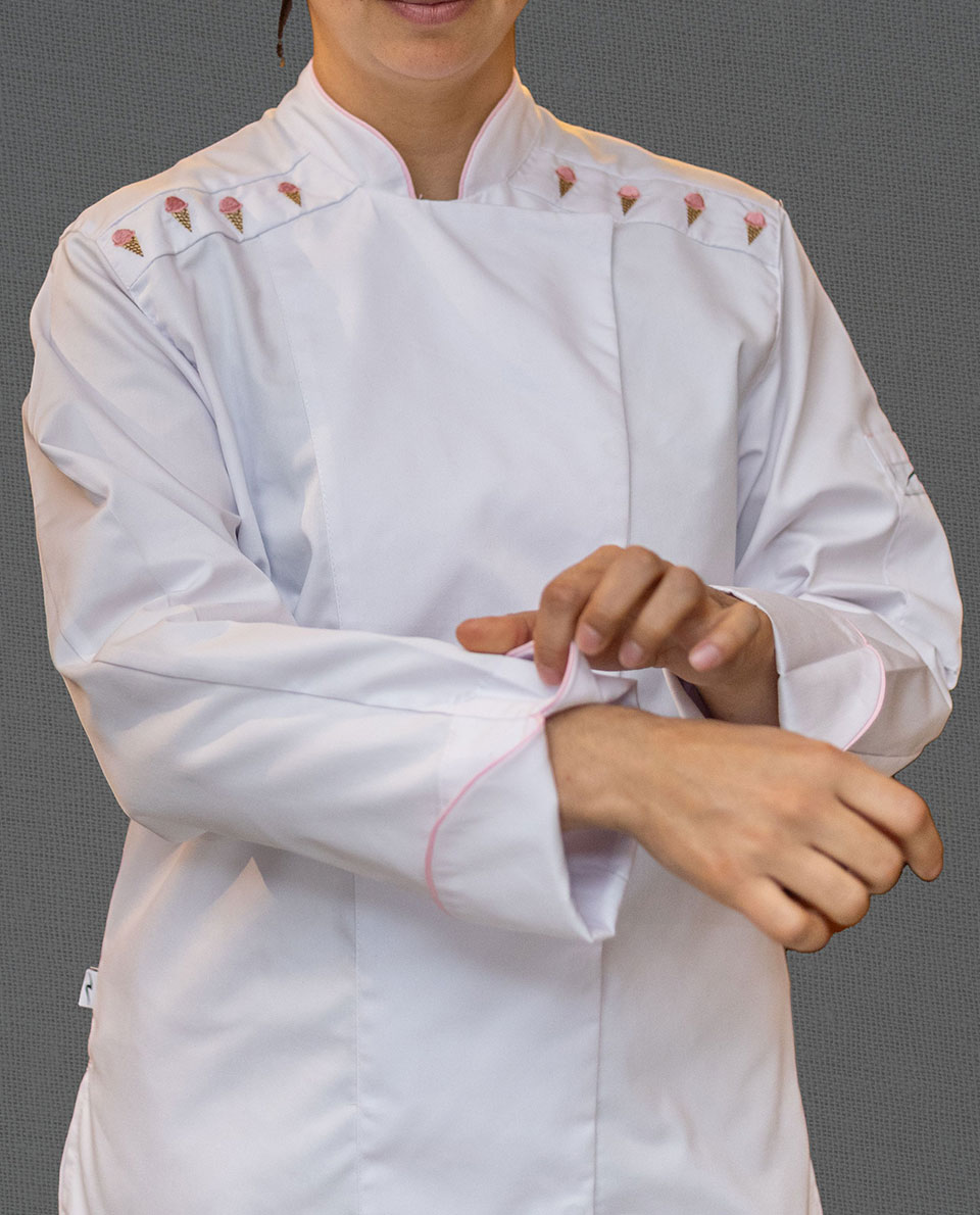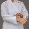 Chaqueta dama caballero en gabardina blanca, manga larga, con vivo «conos» en hombro, broche oculto
