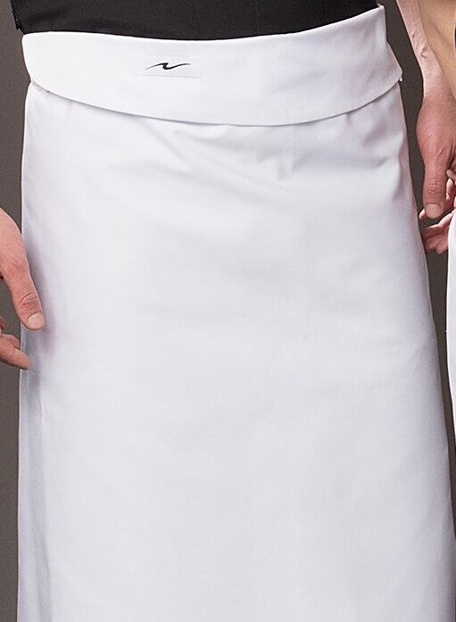 Mico ref  03 blanco en gabardina, con tira para amarrar en cintura y aletilla,  altura arriba rodilla