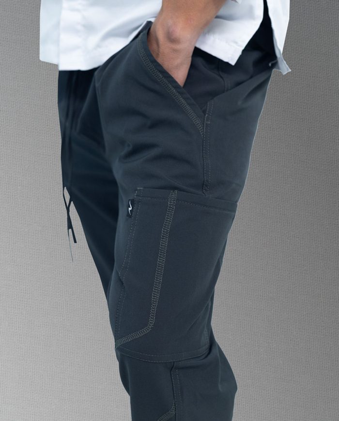 Pantalón diseñado gris con resorte en cintura y tobillo, con bolsillos internos, parche atrás, lateral en pierna,