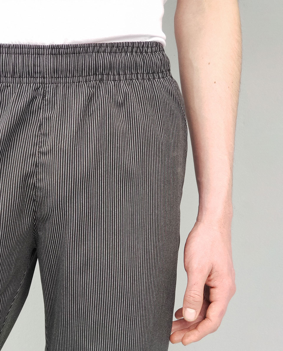 Pantalón resortado fondo negro raya tiza delgada, con bolsillos internos y bolsillo posterior con velcro, composición 100% poliéster