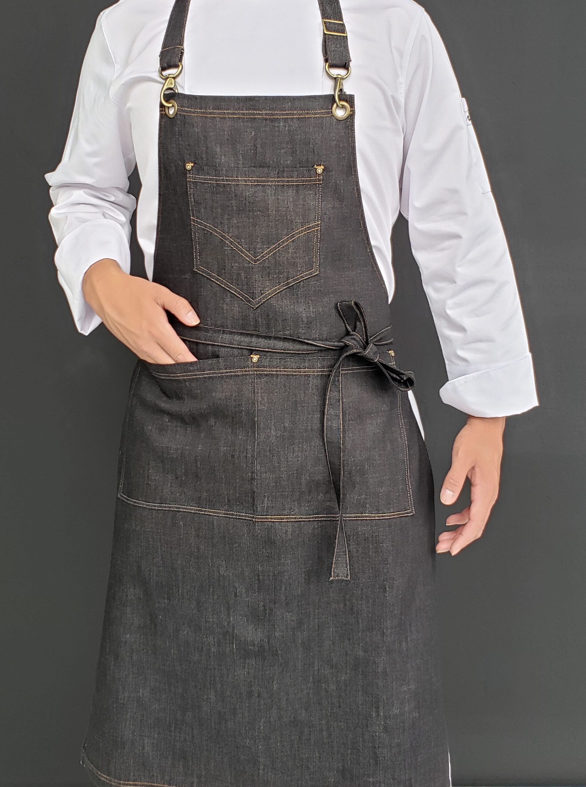 Peto en jean con bolsillo parche en el pecho, y bolsillo doble en la cintura.