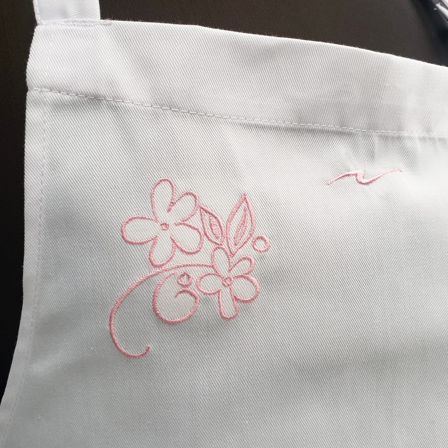 Peto en gabardina blanco, bordado flores, bolsillo con embone rosado, tiras cruzadas