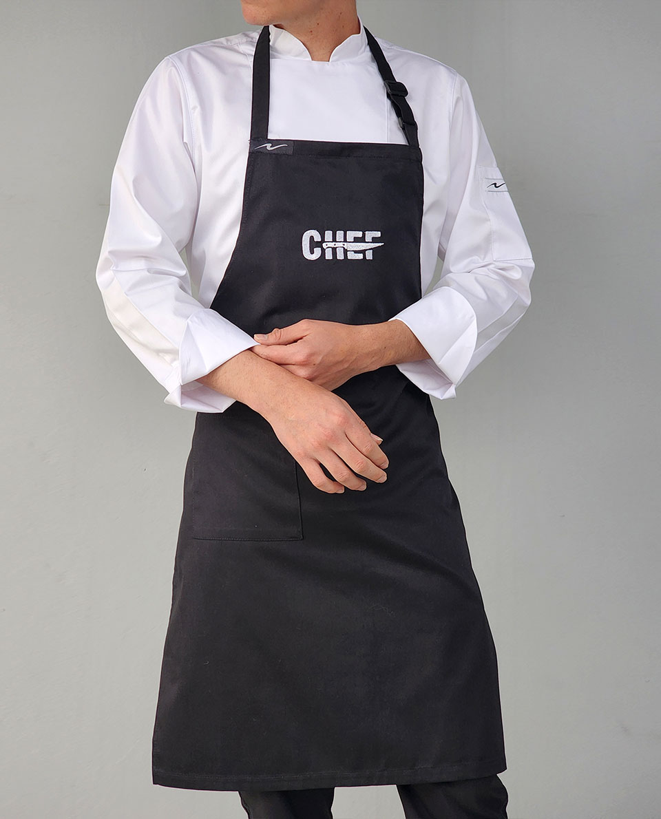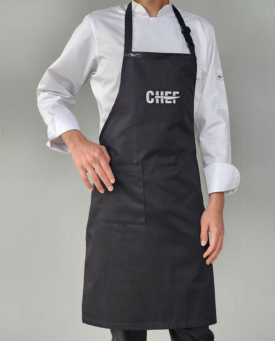 Peto con bolsillo, tela con larga durabilidad, ligera y suave al tacto, color negro con bordado. Composición 65% poliéster 35% algodón