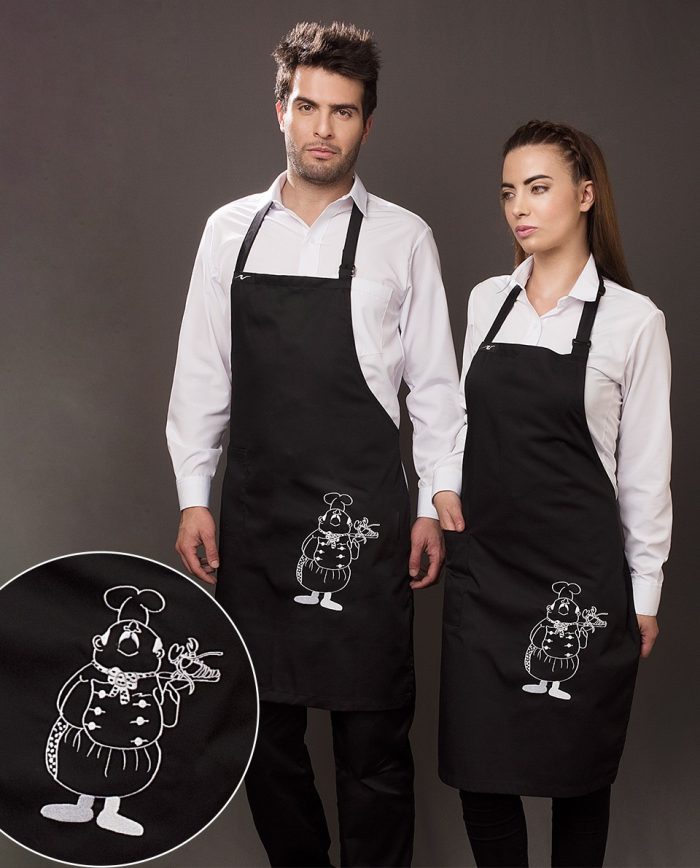 Peto con bolsillo, tela con larga durabilidad, ligera y suave al tacto, color negro con bordado. Composición 65% poliéster 35% algodón
