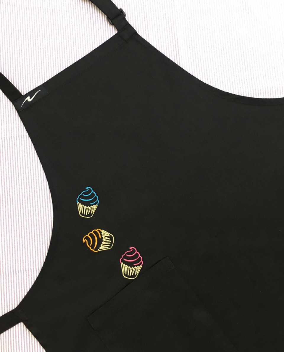 Peto con bolsillo, tela con larga durabilidad, ligera y suave al tacto, color negro con bordado cupcakes Composición 65% poliéster 35% algodón