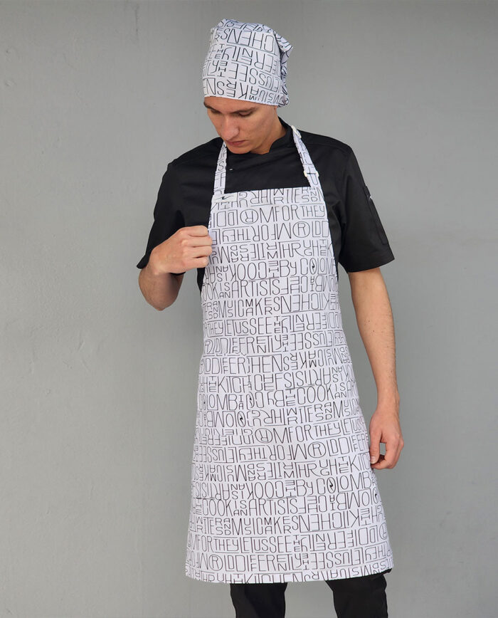 Peto con bolsillo y gorro chef, en tela con larga durabilidad, ligera y suave al tacto, estampado exclusivo. Composición 100% poliéster (antifluido)