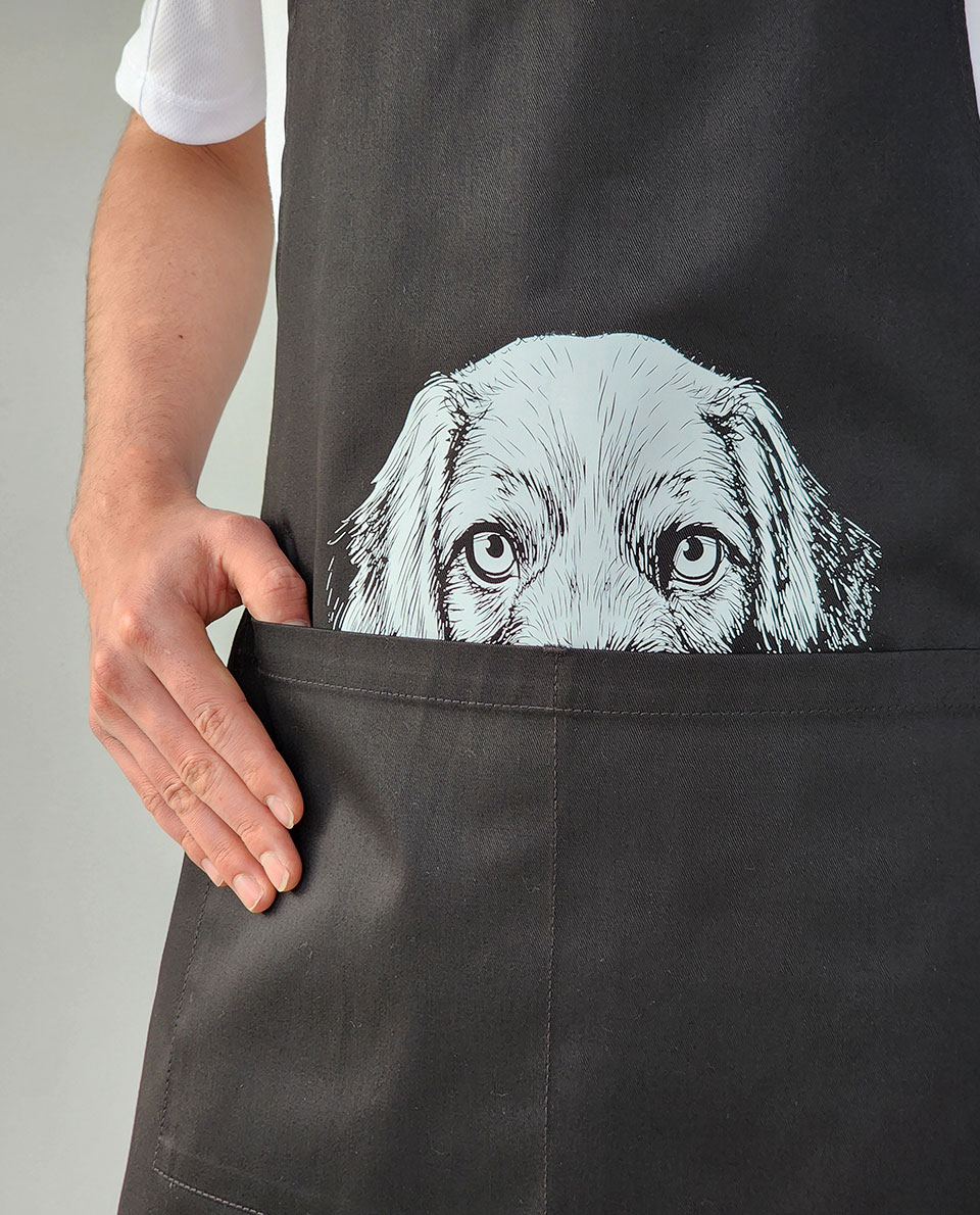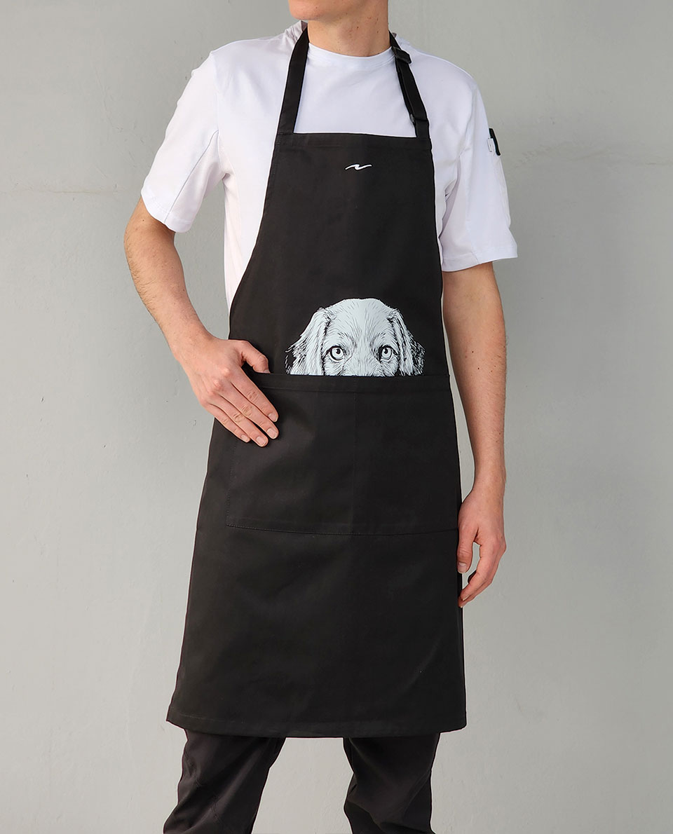 Delantal básico en gabardina negra con estampado arriba del bolsillo Mascota «perro»
