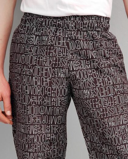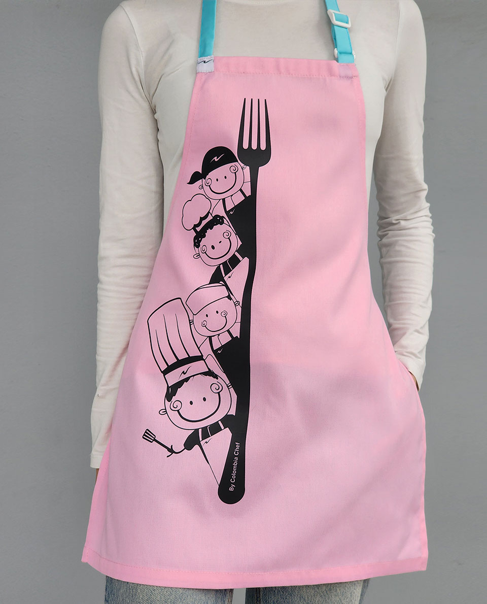 Delantal Clásico Rosado para niño(a), estampado cocineritos en color negro, tira cuello y cintura en color azúl