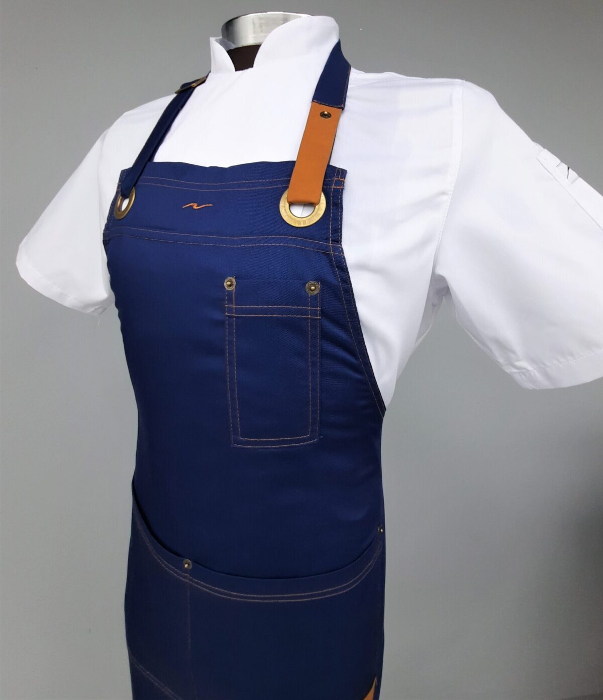 Peto en color azul petróleo , con doble costura color ocre, bolsillo para esfero y doble bolsillo, con ojálate metálico