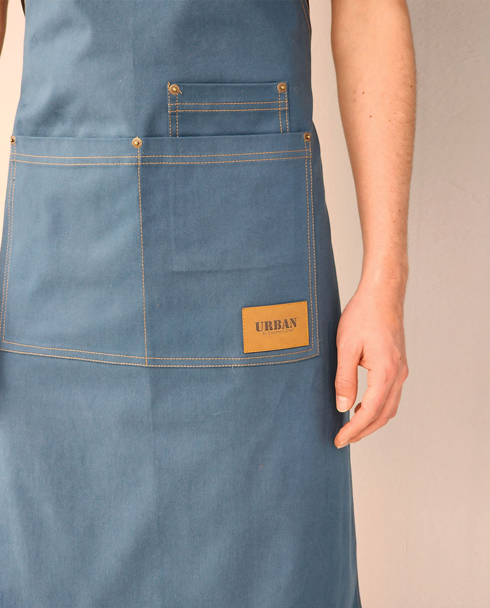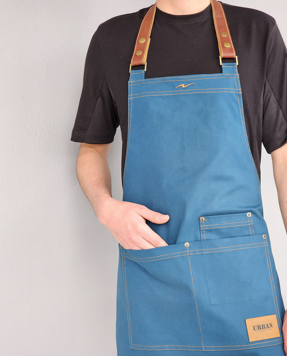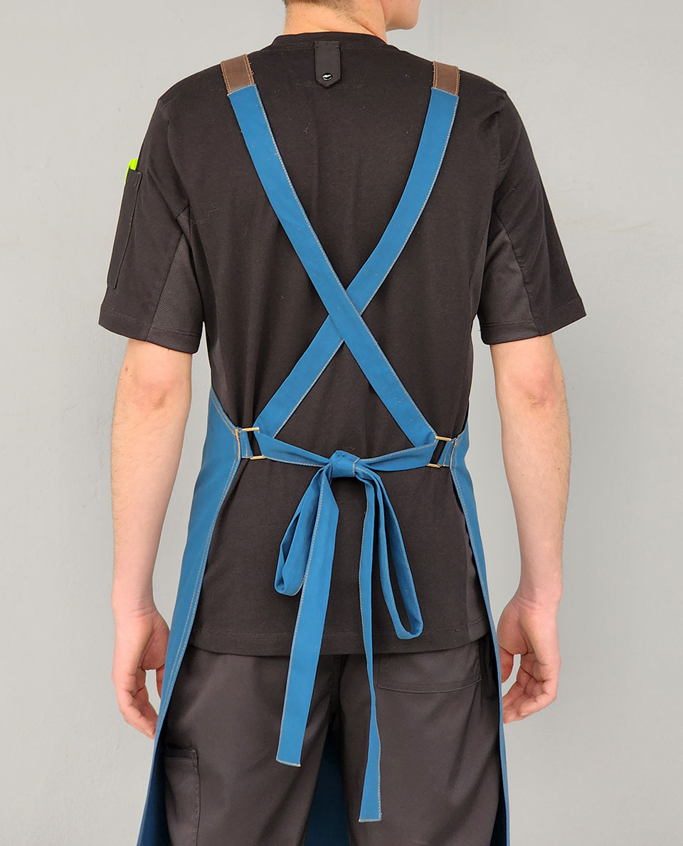 Peto en color azúl petróleo, con doble bolsillo, bolsillo para esfero o comanda pequeña, tiras del cuello en cuero, con doble uso