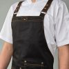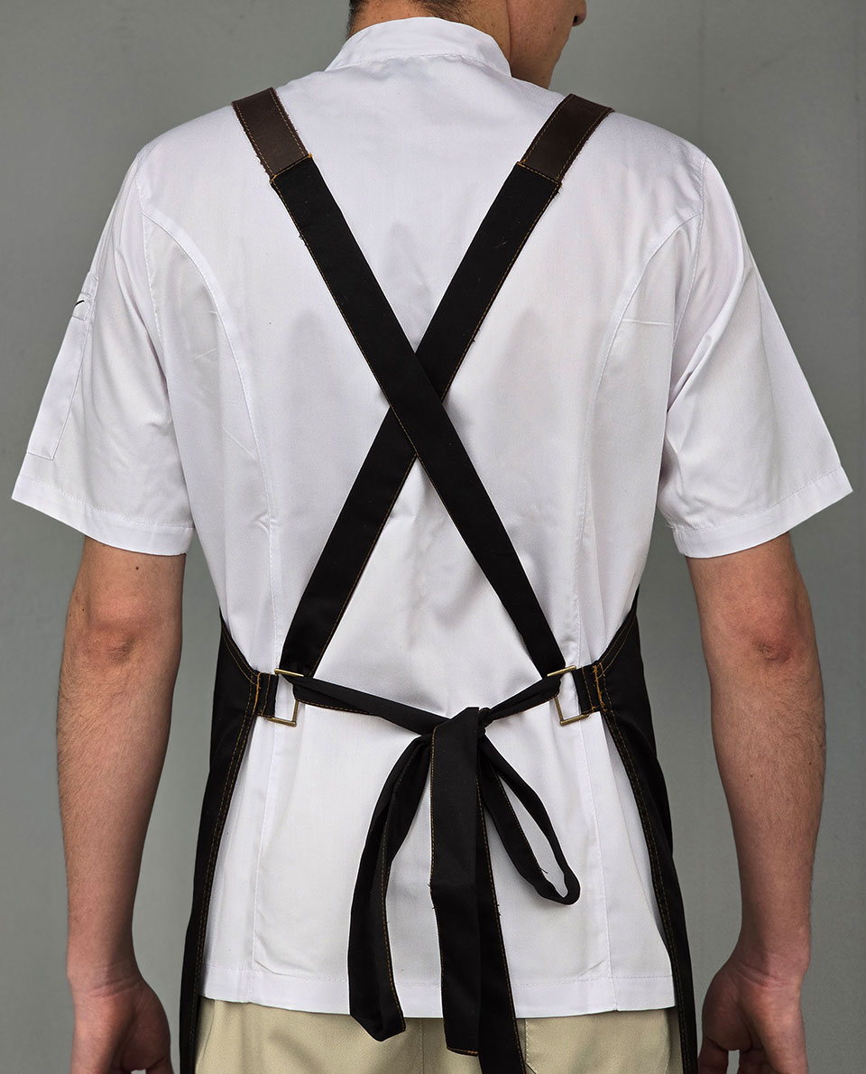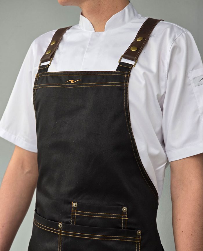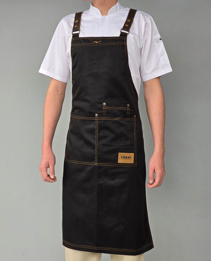 Peto en color negro, con doble bolsillo, bolsillo para esfero o comanda pequeña, tiras del cuello en cuero, con doble uso