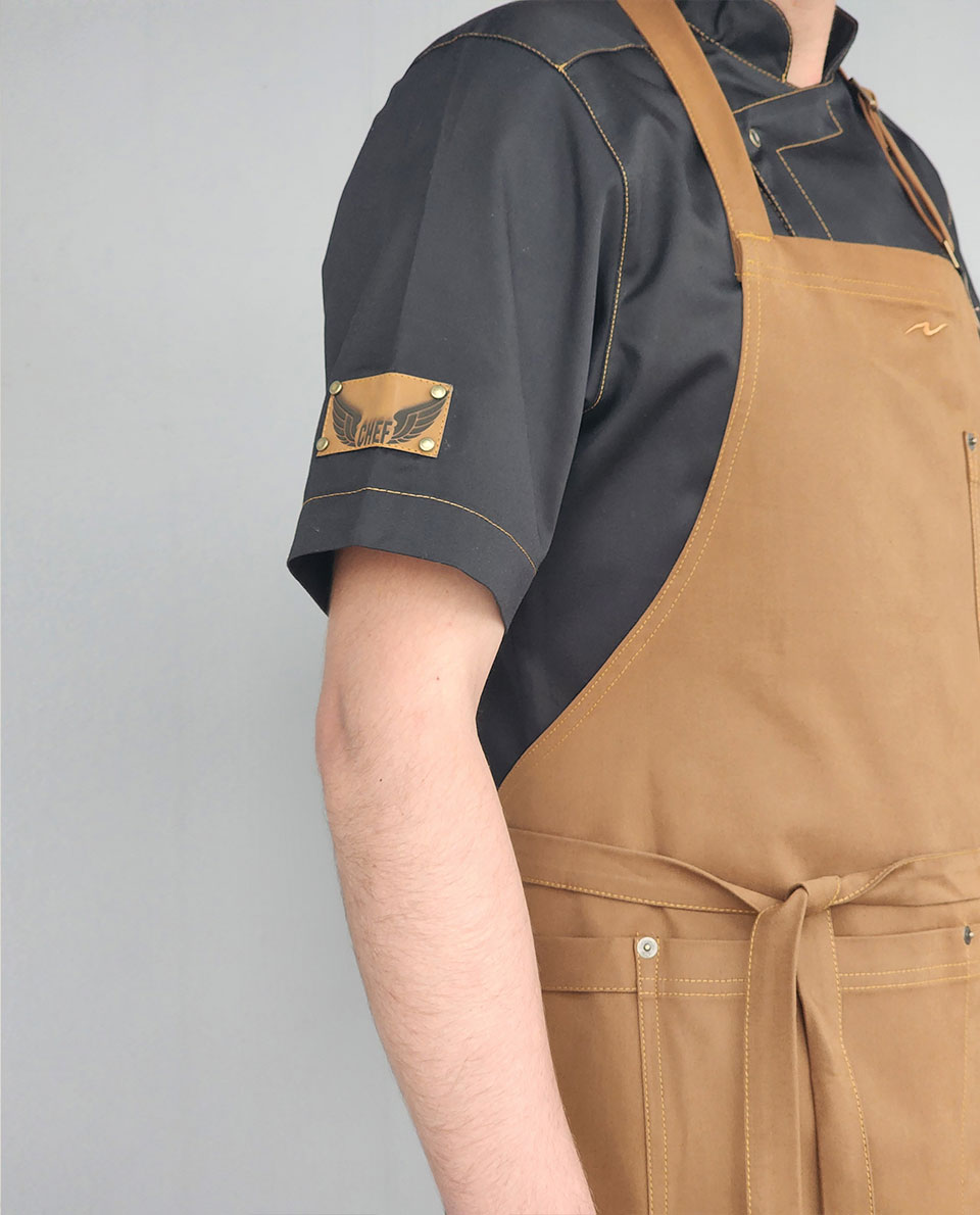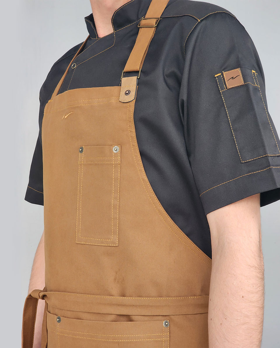 Peto con bolsillo doble al frente, bolsillo termómetro, tela con larga durabilidad, aplicación en cuero,
